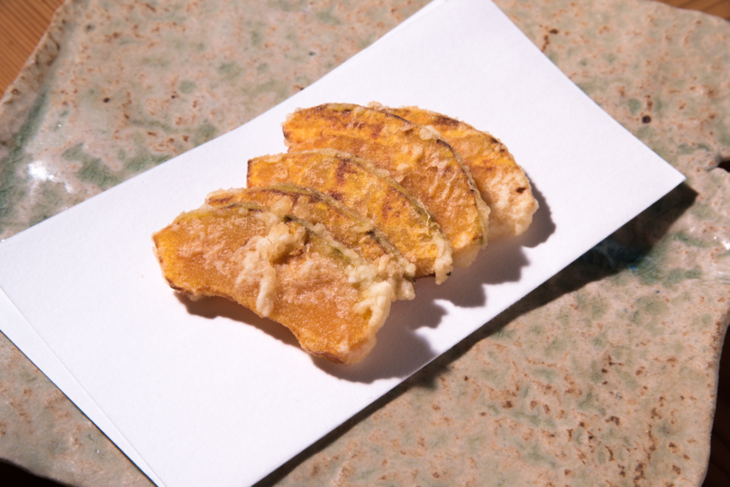 大坂:一番薄い天ぷらは衣と合わせて、軽やかな食感が楽しめる一品に、1センチの天ぷらはかぼちゃの甘さと衣のハーモニーが楽しめて、一番厚いのはかぼちゃの甘さが強調される料理になるんです。